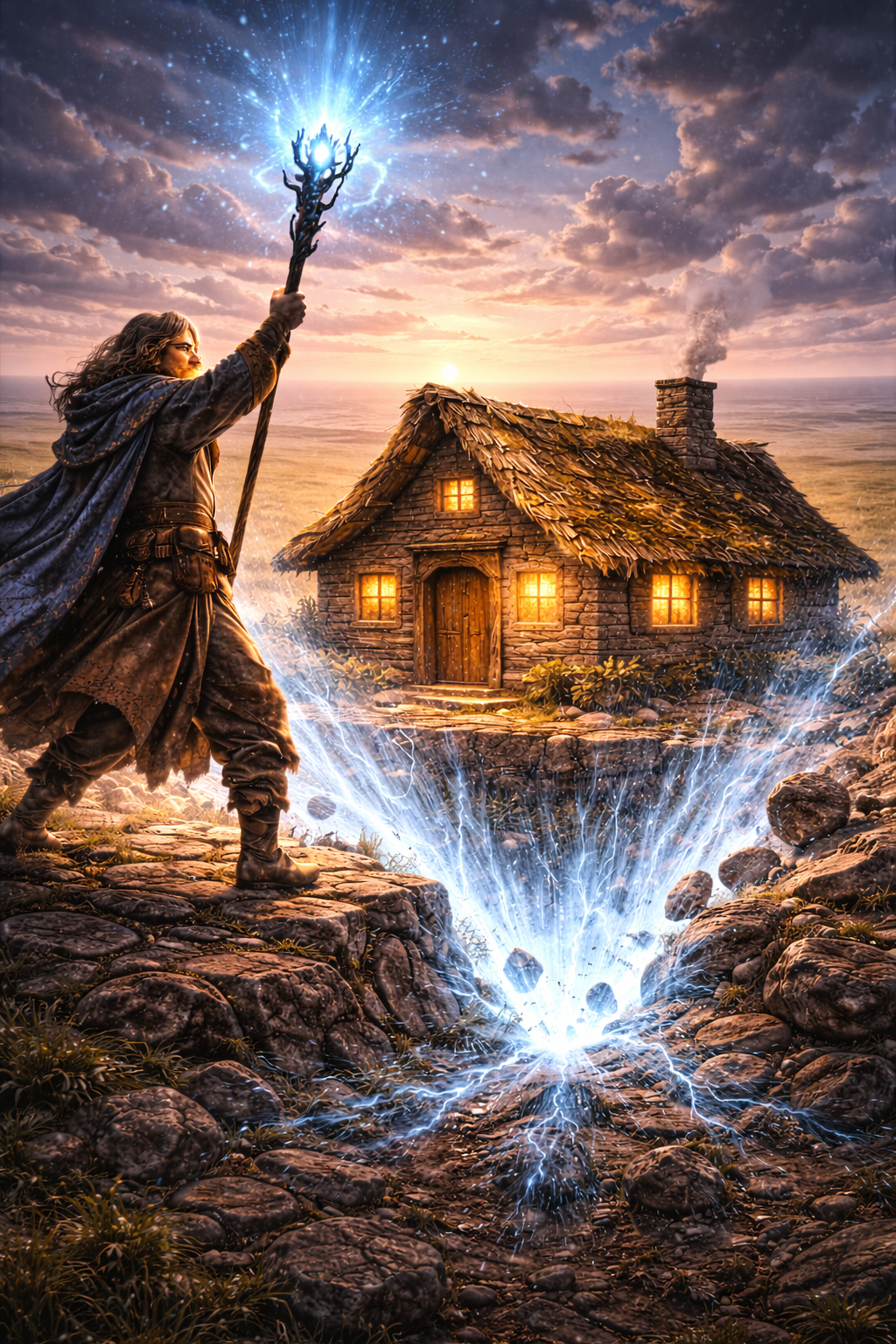 Een klein huis van grijze stenen, met mos tussen de kieren. Op het dak lag riet, met een schoorsteen die een beetje scheef stond. In het midden zat een houten deur, met aan weerszijden een raam, omlijst door sierlijk houtwerk.