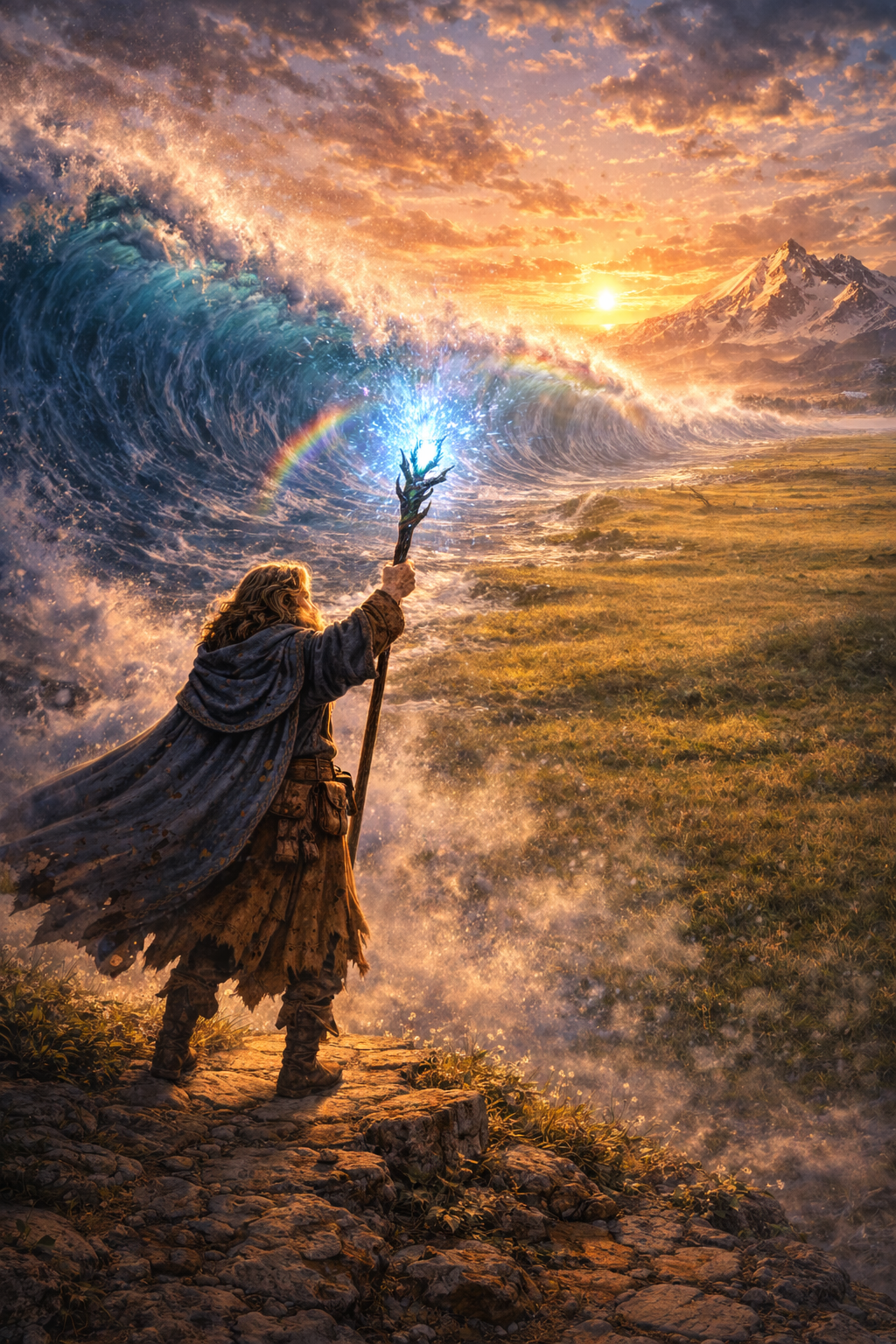 Toen hij hem opnieuw op de grond sloeg, verscheen er in de verte een enorme golf. Meer dan honderd meter hoog. De golf rolde langs de oostkant van het land en zakte vlak voor de bergketen in het noorden weer neer. In het opspattende water verscheen heel even een regenboog.